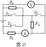 37.如图25所示电路电源两端电压保持不变。R3=6Ω,只断开开关S1时,电压表的示数为U;只闭合S1时,电流表的示数为I;开关全断开时,电压表的示数为U ¢,电流表的示数为I ¢,电阻R3的功率为1.5W。已知U∶U ¢=7∶5,I∶I ¢=2∶1。