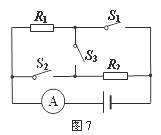 16.如图7所示,电源电压不变,只闭合S1与只闭合S3电流表的示数之比为3 : 2,下列说法正确的是: