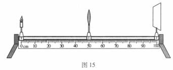 30.小英探究凸透镜成像规律的实验装置如图15所示,其中焦距为12cm的凸透镜固定在光具座上,位于50cm刻度线处,光屏和点燃的蜡烛位于凸透镜两侧。小英将蜡烛移至20cm刻度线处,移动光屏,直到光屏上出现了烛焰清晰的像,则该像是倒立、缩小的 像(选填“实”或“虚”)。小英将蜡烛移至40cm刻度线处时,她通过凸透镜看到了烛焰的虚像,则该像是 、放大的像。(选填“倒立”或“正立”)