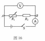 32.为了探究电阻串联的问题,小芳设计了如图16所示的实验电路,其中R1是电阻箱,R2是定值电阻,R1与R2串联的总电阻(即等效电阻)用R来表示。电流表测量的是串联电路中的电流I,电压表测量的是A、B两点间的电压U。小芳通过实验记录的数据如下表所示。请根据表中实验数据,归纳出总电阻R跟电阻R1的关系: 。