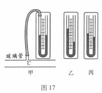 33.小华探究气体压强与流速关系的实验装置如图17甲所示,其中两端开口的U形管中有适量的水,U形管的左端通过橡皮管与玻璃管侧壁管口相连通。小华用电吹风机向玻璃管中吹风,玻璃管内C点的气体压强为p1,U形管内液面高度差如图17乙所示;改变风速后,玻璃管内C点的气体压强为p2,U形管内液面高度差如图17丙所示。请你根据上述实验现象比较p1与p2的大小,则p1 p2。(选填“大于”、“等于”或“小于”)