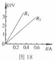 34.在探究电阻两端的电压跟通过电阻的电流的关系时,小东选用了两个定值电阻R1、R2分别做实验,他根据实验数据画出了图18所示的图像,请你根据图像比较电阻R1与R2的大小,R1 R2。(选填“大于”、“等于”或“小于”)