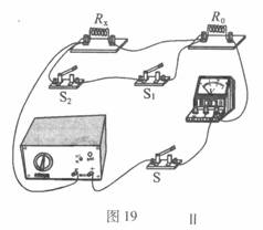 35.小龙想利用一块电压表和已知的电阻R0测量电阻Rx的阻值。小龙选择了满足实验要求的器材,并连接了部分实验电路,如图19所示。小龙设计的实验电路的要求是:只闭合开关S和S1时,电压表测量的是电阻R0两端的电压U1;只闭合开关S和S2时,电压表测量的是电源两端的电压U2。