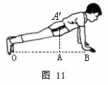 18.(8分)俯卧撑是一项常见的体育健身活动。如图11所示是小明同学做俯卧撑时的示意图。小明重600N,1min钟内做俯卧撑30个,每做一次肩膀升高50cm。小明身体可视为杠杆,O为支点,