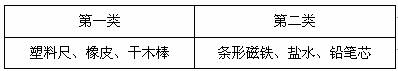6、现有塑料尺、橡皮、条形磁铁、盐水、干木棒、铅笔芯等六种物质,表中是按物质的哪种属性进行分类的( )