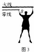 泡接到两导线头A、B之间,灯泡正常发光;随后将灯泡取下,“法师”两手分别抓住两导线头A、B,如图3所示,其助手用测电笔分别测试A、B及“法师”的皮肤.发现测电笔的氖管都发光。对此表演的合理解释是