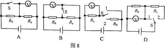 14.某同学在没有电流表的情况下,利用电压表和已知阻值的定值电阻R0,测量未知电阻Rx阻值,图8中可实现测量R阻值的正确电路图是