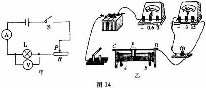 18.在“测定小灯泡的额定功率”实验中,张超同学用一个电压表、一个电流表、二个开关、电压为6V的电源、额定电压为3.8 V的小灯泡和一个标有“20Ω,1.5A”的滑动变阻器,设计了如图14甲所示的电路。