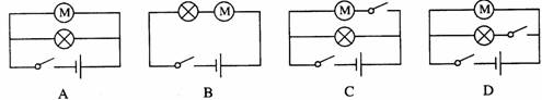 8.教室里投影仪的光源是强光灯泡,发光时必须用风扇给予降温。为了保证灯泡不被烧坏,要求:带动风扇的电动机启动后,灯泡才能发光;风扇不转,灯泡不能发光。则在如图所示的四个电路图中符合要求的是 ( )