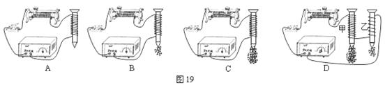 31.为探究电磁铁的磁性强弱跟哪些因素有关,小明所在的实验小组用漆包线(表面涂有绝缘漆的导线)在大铁钉上绕若干圈,制成简单的电磁铁,结合其他实验器材做了如图19所示的实验(图中线圈匝数的疏密表示线圈匝数的多少,各图中的滑动变阻器、电源和大铁钉均相同)。实验中通过观察电磁铁吸引大头针数目的多少,来判断它的磁性强弱