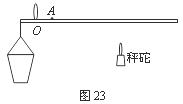35.小明利用轻质硬棒(可视为杠杆)和透明塑料小桶等器材制作了如图23所示的测量液体密度的秤:用细线做成提纽系在O点将硬棒吊起,棒的一端悬挂塑料小桶(小桶中可装水或其他待测液体)。另外找一个重物做为秤砣,通过调节秤砣在硬棒上悬挂的位置,可使硬棒(杠杆)处于水平平衡。以下是小明测量某种待测液体密度时的实验步骤的一部分,请你将实验步骤补充完整。