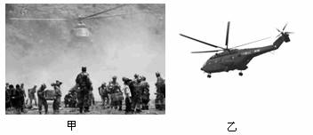 9.由于通往灾区的道路严重损毁,解放军多次出动飞机参与抗震救灾。如图所示,甲图为解放军某陆航团直升机运送救灾物资至灾区降落前悬停在空中的情景,请在图乙中作出此时直升机所受升力和重力的示意图。