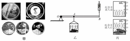 小明的爸爸通过中国银行的网点订购了一套。小明想知道纪念章的密度。他手中只有一只量程很小的弹簧秤,于是他设计了如图乙所示的装置。图中OA∶OB=1∶3,用细绳把装有部分水的量杯悬挂于A点,用弹簧秤在B点施加一个竖直向上的力,当OB杠杆水平静止时,弹簧秤读数为0.30N;当把两枚相同的纪念章放入量杯中,OB杠杆水平静止时弹簧秤读数为0.55N。纪念章放入前、后量杯中的水位如图丙所示。