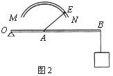 9.如图2所示,O为杠杆的支点,在杠杆的右端B点挂一重物。MN是以A为圆心的弧形导轨,绳的一端系在杠杆的A点,另一端E可以在弧形导轨上自由滑动。当绳的E端从导轨的一端N点向另一端M点滑动的过程中,杠杆始终水平,绳AE对杠杆拉力的变化情况是