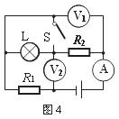 12.如图4所示电路,电源两端电压U保持不变。灯上标有“4V 2W”字样,灯的电阻不受温度影响。当开关S断开时,灯泡正常发光,电压表V1与V2的示数之比为1:2;当开关S闭合时,电流表示数改变了0.2A。下列说法中正确的是: