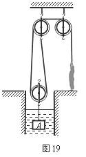 38.小强身体质量是60kg,当他用图19所示滑轮组匀速提升浸没在水中的物体A时,他每只脚与地面的接触面积是200cm2,对地面的压强是1.4×104Pa。当他把物体A提升2m时,对物体A做功120J,不计绳重、滑轮摩擦及水的阻力。(g取10N/kg)求: