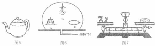 16.如图6,密闭的玻璃罩内有三个小实验,A为用薄塑料片托住装满水的杯子来验证大气压的存在,B为充满气的气球,C为加热到97