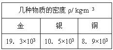 三种奖牌各部分的体积、形状完全相同,几种物质的密度如表中所示。若银牌中银的质量约为105g,则铜牌中铜的质量大约________ g。