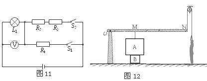 22.如图11所示的电路中,已知灯L1的电阻R1是电阻R2的 (不考虑灯丝电阻随温度的变化)。电源电压保持不变,当开关S1闭合、S2断开时,灯L1正常发光,电阻R4消耗的电功率为P;当开关S2闭合、S1断开时,电阻R3消耗的电功率为P,此时电压表的示数变为原来的一半。则灯L1的额定功率为 。