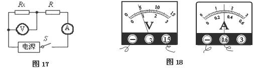 28.用“伏安法测电阻”的实验中,第三小组的同学设计了如图17所示的实验,他们在实验中闭合开关S后,发现电流表示数几乎为零,而电压表的示数等于电源电压。则该电路的故障可能为 ;故障解除后在实验过程中,闭合开关S,电流表和电压表的示数如图18所示,电阻Rx的阻值是 Ω。