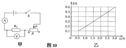 29.图19甲是研究电流与电压关系的电路图。开关S闭合后。将滑动变阻器的滑片P从a 端移至b端,电流表和电压表的示数变化关系如图19乙所示.实验时,电源电压3V保持不变,结合图像可知,当滑片P位于b端时,定值电阻R0的电功率是 W。