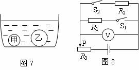 22.有质量相同的甲、乙两个小球,已知甲球的密度为5×103kg/m3,乙球的密度为2×103kg/m3。将两个小球如图7所示放入水槽中沉底后,甲、乙两个小球对水槽底部的压力之比F甲∶F乙=________。