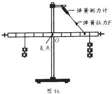 (1)小明的实验是“探究杠杆的平衡条件”,他在完成教材中的探究任务后,又多加了一个弹簧测力计继续进行探究。他的困惑是:在图16所示杠杆已经平衡的情况下,不知道怎样测弹簧拉力的力臂。