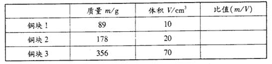 (2)小亮的实验是“探究同种物质的质量与体积的关系”,他选择了三个体积不同,质量分别为89 g、178 g、356 g的实心铜块做实验。实验中,他用每次都盛有30 cm3水的量筒分别测出了三个铜块的体积,并将数据记录在了自己设计的表格中。