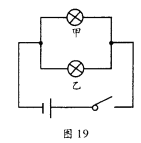 3.如图19所示,小亮做实验时,把甲、乙两只灯泡并联后接在电源上。闭合开关后,发现甲灯发光,乙灯不发光。经检查,电路连接正确,两只灯泡都完好无损。则乙灯不发光的原因最有可能是