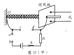 7.小明、小亮和小敏共同设计了一种测定水平方向风力的装置。其原理如图21(甲)所示:绝缘轻弹簧的左端固定在D点,右端与中心有孔、表面竖直的金属迎风板相连,一起套在左端也固定在O点的粗细均匀、电阻随长度均匀变化,且水平放置的金属杆上,迎风板与金属杆接触良好;电路中左端导线与金属杆的左端相连,右端导线连接在迎风板上并可随迎风板移动,R是定值电阻,a、b、c、d为四个接线柱。