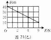 ①小明利用测量的数据作出了原长为40 cm的轻弹簧的长度l与所受压力F的关系图象[见图21(乙)。由图可知:该弹簧每缩短10 cm,弹簧受到的压力将增加____N。