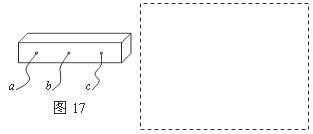 23.(4分)如图17所示,黑盒内是由一节3V的电池和两个等值电阻连接成的部分电路,a、b、c是由电路不同引出的三根导线。将电流表与a、b试触后相连,示数是0.3A;将电流表与a、c试触后相连,示数也是0.3A;将电流表与b、c试触后相连,示数是零。由此可判断出黑盒内电路的连接情况。请在虚线框内画出盒内各元件的连接情况。