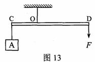 21.如图13所示,将所受重力为G的实心物体A挂在轻质杠杆的C端,在杠杆D端施加一个竖直向下的拉力F时,杠杆水平平衡;将物体A浸没在水中,施加在D端竖直向下的拉力的大小变为0.8F时,杠杆仍然能保持水平平衡。由以上条件可知,物体A的密度是水密度的_______倍。