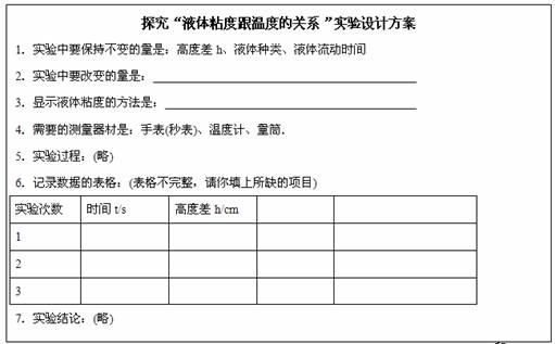 (5)实验结束后,小明又产生了一个新的问题:“液体的粘度跟温度有什么关系?”大家决定利用上面的装置,用色拉油来做实验(每做完一次实验,都将有关器材清洗干净),下面是小组同学们初步设计的方案,有些还不完整,请你帮助他们补充完整.
