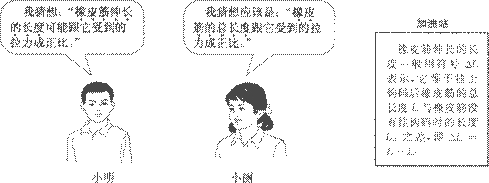 31.(7’)在“制作一个橡皮筋测力计”的小组活动中,小军提出了一个问题:“在一定的弹性范围内,橡皮筋伸长的长度跟它受到的拉力可能存在什么关系?”小明和小丽经过思考后的猜想如图所示。究竟是谁的猜想正确呢?他们决定一起通过实验来验证自己的猜想.