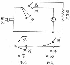 33.如下图所示,是理发用电吹风机的典型电路.其中电热丝通电后可以发热,电动机通电后可以送风,选择开关分别放在“热”“冷”“停”三个位置,请你分析一下这个电路的工作原理。