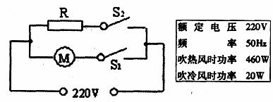 21.小红学了电路知识之后。对电路很有兴趣。看到家里的电吹风,便把它拆开来研究,并画出了如下电路图(为电吹风中带动风扇的电动机)。她认为当只闭合开关S1时,电吹风吹冷风;当S1和S2都闭合时,电吹风吹热风。小芬看了她画的电路图觉得有问题:如果仅闭合S1,会出现电热丝R工作而电动机不工作的现象,从而使电吹风的塑料外壳过热造成损坏。小芬认为只要把其中一个开关移到干路上,就能做到电热丝R工作时,电动机就一定在工作,从而保证塑料外壳不会因操作失误而损坏。请分析回答下列问题: