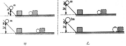 (1)让质量相同的两个小球沿同一光滑斜面分别从A处和B处开始向下运动,然后与放在水平面上的纸盒相碰,纸盒在水平面上移动一段距离后静止,如图甲所示。