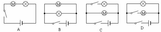8.多媒体教室里的投影仪的光源是强光灯泡,发光时温度很高,必须用风扇给予降温,为了保证灯泡不被烧坏,要求:启动时,带动风扇的电动机启动后,再让灯泡发光,风扇不转,灯泡不能发光;关闭时,先关闭灯泡,风扇继续给灯泡降温一段时间才能断开电风扇。则如图所示的四个电路中不符合要求的是 ( )