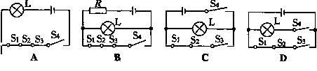 12、小轿车上都装有一个用来提醒司机是否关好车门的指示灯。四个车门中只要有一个门没关好(相当于一个开关断开),该指示灯就会发光。下图所示的模拟电路图符合要求的是