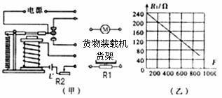 3、小明设计了一种“自动限重器”,如下图(甲)所示。该装置由控制电路和工作电路组成,其主要元件有电磁继电器、货物装载机(实质是电动机)、压敏电阻R1和滑动变阻器R2等。压敏电阻R1的阻值随压力F变化的关系如下图(乙)所示。当货架承受的压力达到限定值,电磁继电器会自动控制货物装载机停止向货架上摆放物品。已知控制电路的电源电压U=6V,电磁继电器线圈的阻值忽略不计。请你解答下列问题: