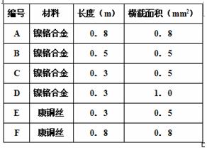 4、“探究导体电阻与导体长度、横截面积、材料”的实验电路如下图所示,a、b、c、d是四种不同的金属丝。现有几种康铜合金丝和镍铬合金丝,其规格如下表所示。