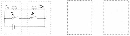 21.小亮和小刚是同班好朋友,又是住在同一家属楼上下层的邻居,经常一起去上学。为了相约方便,他们想连接一个能够相互呼叫的电路,只要一方按下自己书桌上的开关,对方书桌上的电铃就会响。下图是他们设计的电路,你认为这个电路图符不符合要求,如果不符合,请在右边虚线框中画出改正的电路图(不准添加器材)。