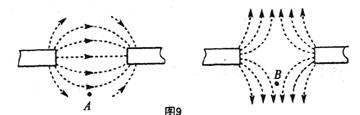 9.图9中的两个图分别画出了两个磁极间的磁感线。请在图中标出磁极的名称,并画出位于图中A点和B点的小磁针静止时北极所指的方向。