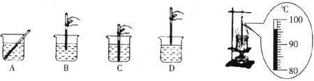 (2)在探究水的沸点的实验巾:小明观察到同学们测水温的操作有如下左图所示的四种,你认为正确的是__________;当水沸腾的时候,小明的温度计的示数如下右图所示,此时水的沸点是__________℃;如果继续给沸腾的水加热,水的温度__________(填“升高”、“不变”或“降低”)。