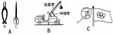 这两种剪刀在使用时都不能省 ;如图B所示,工程车上的起重臂是一个杠杆,使用它的好处是能够省 ;如图C所示,A装置是 滑轮,它的实质是一个 。