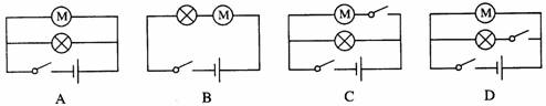 8.教室里投影仪的光源是强光灯泡,发光时必须用风扇给予降温。为了保证灯泡不被烧坏,要求:带动风扇的电动机启动后,灯泡才能发光;风扇不转,灯泡不能发光。则在如下图所示的四个电路图中符合要求的是( )