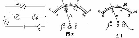 33.(2分)如图所示,电源电压示数如图甲,若电流表A1示数、电流表A的示数均如图丙所示。