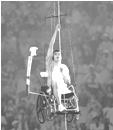 36.(6分)如下图所示,是2008北京残奥会开幕式最后一棒火炬手侯斌,靠自己双手的力量,攀爬到火炬台底部并最终点燃圣火的照片,该点火仪式充分体现了残疾人自强自立。拼搏向上的勇气和精神。已知他和轮椅总质量为80kg,攀爬高度39m,历时约3min20s。![]()