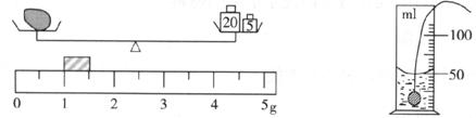 (4)小红在做测定石块密度的实验,测量石块的质量时,所加砝码和游码位置如下左图所示,把石块放入量筒内的水中时,如下右图所示,请你帮她填好下表的数据: